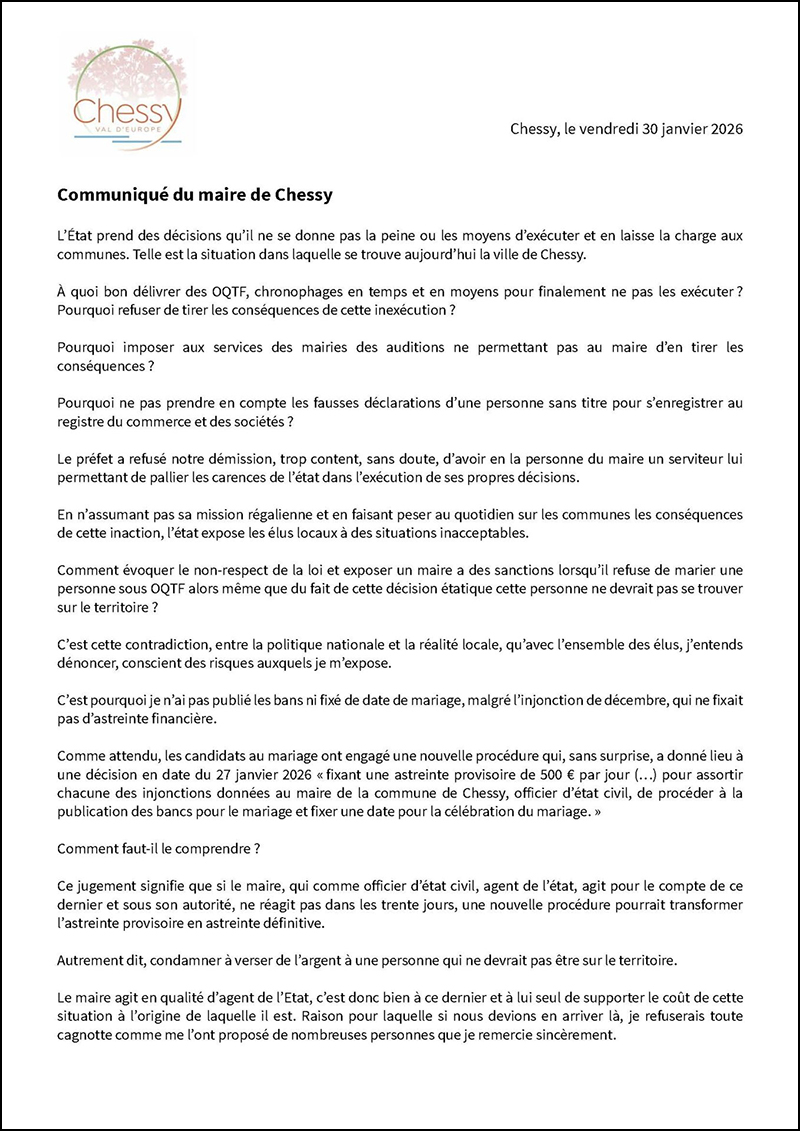 Bravo à monsieur le maire de Chessy Olivier BOURJOT qui, contre et vents et marées des délires immigrationnistes et soi-disant humanistes, refuse toujours de marier un OQTF et sa chère dulcinée finlandaise.